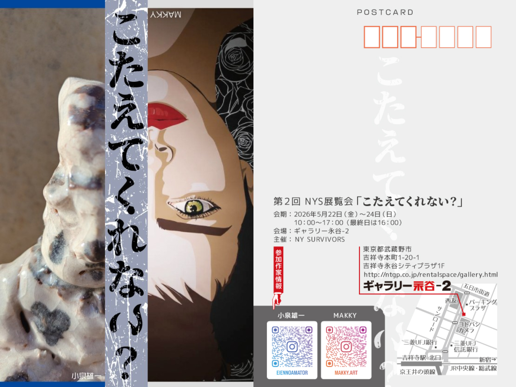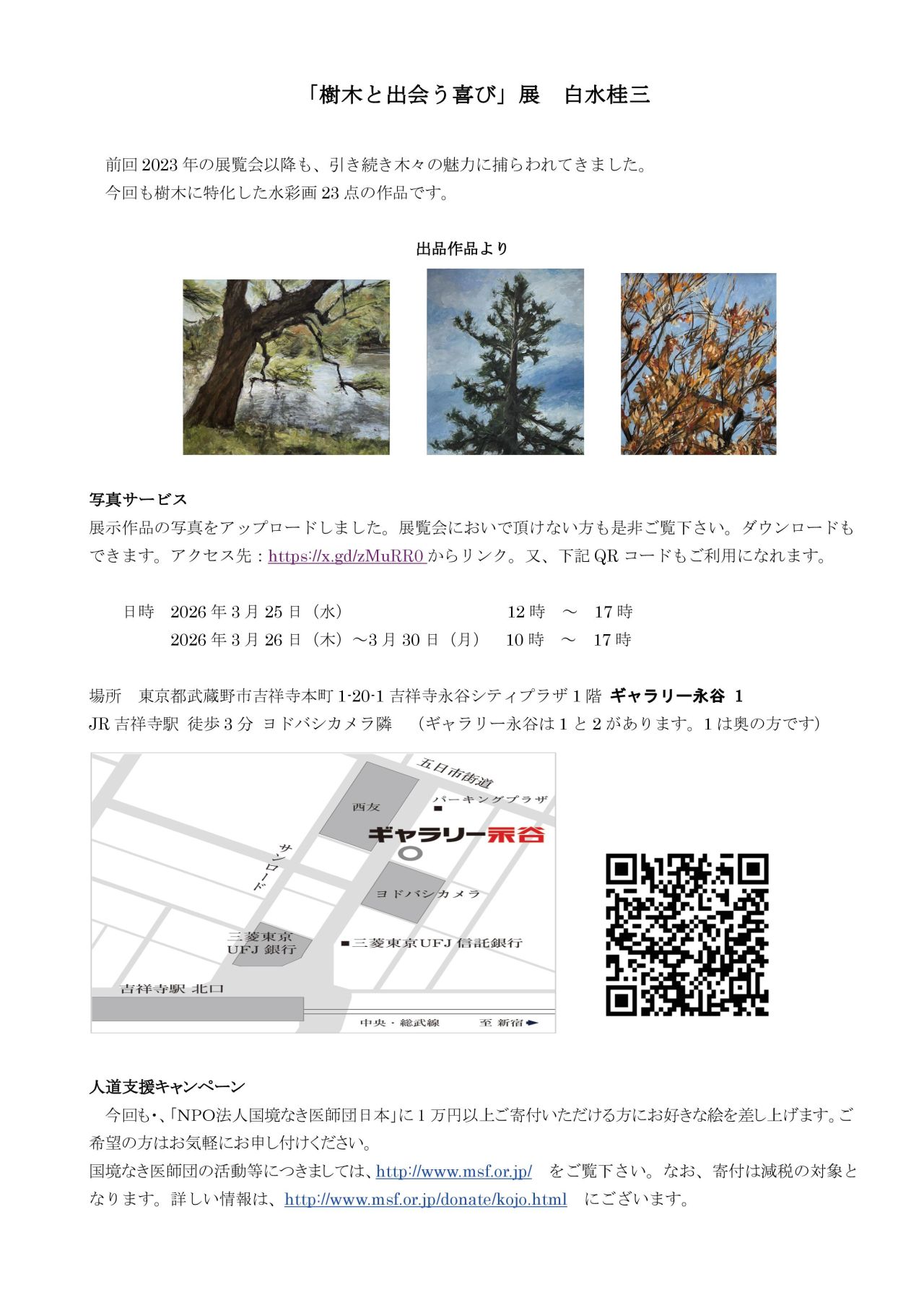 吉祥寺駅から徒歩3分 ギャラリー永谷は文教地区・吉祥寺大通りに 面した、ガラス張りの空間が魅力的な 貸しギャラリー(貸画廊)です。 絵画・陶芸・美術工芸品の個展・グループ展・教室の作品展などに使用できます。 レンタル料12,100円より(学割有) |